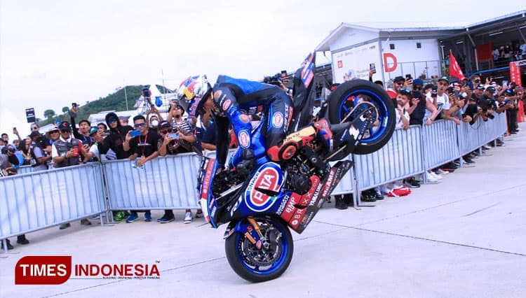 TIMES Jateng/Pembalap PATA Yamaha Brixx Toprak Razgatlioglu melakukan atraksi stopie ban depan usai memenangi race 1 WSBK Mandalika 2022, Sabtu (12/11/2022). (FOTO: Tria Adha/TIMES Indonesia).