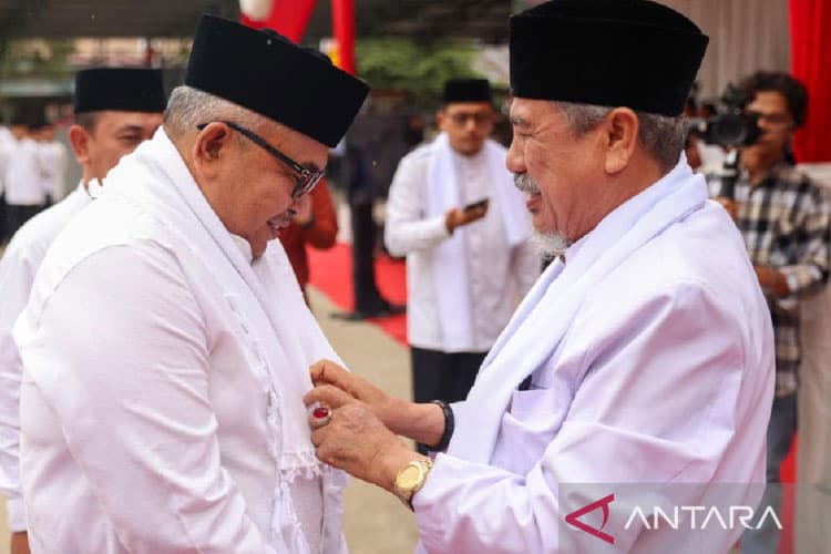 TIMES Jateng/Pimpinan pesantren Insafuddin Banda Aceh memberikan kain kepada Sekda Aceh Bustami Hamzah usai peringati Hari Santri, di Banda Aceh, Selasa (24/10/2023). (FOTO: ANTARA/HO/Humas Pemprov Aceh)
