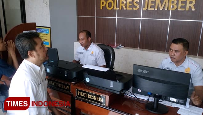 TIMES Jateng/Wakil Ketua Bidang Litbang dan IT DPD Partai Perindo Kebupaten Jember, Ahmad One Prastiono saat melaporkan Ketua DPD Partai Perindo Kabupaten Jember Hanung Prijobodo ke Polres Jember, Senin (6/5/2019). (FOTO: Dody Bayu/TIMES Indonesia)